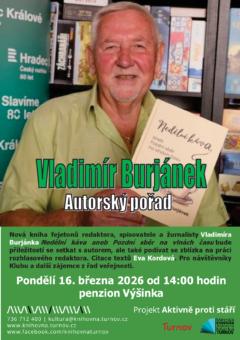 Nová kniha fejetonů redaktora, spisovatele a žurnalisty Vladimíra Burjánka „Nedělní káva aneb Pozdní sběr na vlnách času“ bude příležitostí na setkání s autorem. Citace textů Eva Kordová. Koná se pro obyvatele penzionu Výšinka a další zájemce z řad veřejnosti....