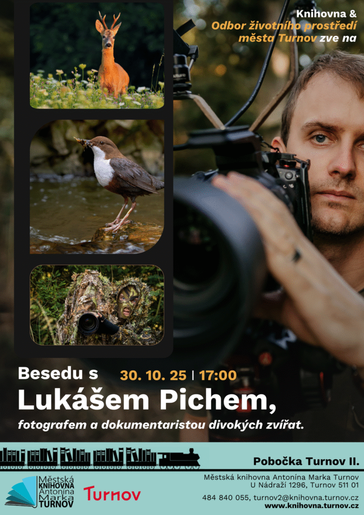 Lukáš Pich je fotograf, který se zaměřuje na dokumentární fotografii, a to zejména zvířat žijících v divoké přírodě. Přijďte na zajímavou besedu o přírodě kolem nás. Akce se pořádá ve spolupráci s Odborem životního prostředí města Turnov.