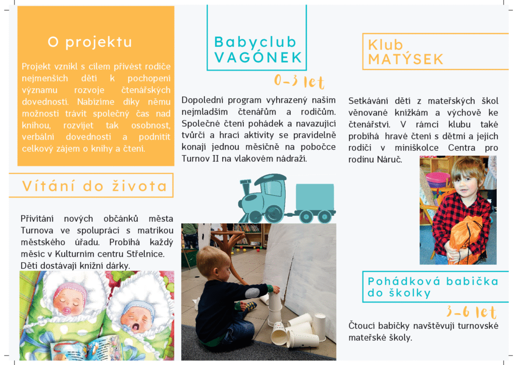 Součástí projektu Bookstart S knížkou do života je také tradiční vítání malých občánků, které pořádá město Turnov, matrika úřadu ve spolupráci s dalšími organizacemi. Naše knihovna dlouhodobě předává rodičům malého občánka dárkový set s knížkou a propagačními i hravými materiály. Nechybí také nabídková brožurka se všemi aktivitami, které knihovna pro rodiny s dětmi pořádá.