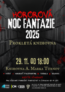 Není divu, že knihovna potřebuje novou budovu. V jejích zdech totiž straší! Podaří se nám zlomit prokletí knihovny? Přijďte se s námi bát a užijte si netradiční přespání v knihovně. Celou noc budou provázet deskové hry, kvízy a tombola. Budete se moci zapojit do velkého hororového kvízu, nechat si vytvořit malování na obličej a užít si další tematické aktivity.