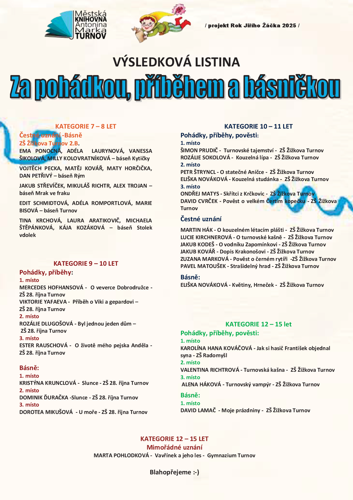 Vyhlášení nejlepších literárních autorů, kteří se zúčastnili literární soutěže Za pohádkou, příběhem a básničkou se uskuteční v novém Klubu a knihovně na Základní škole Žižkova a to ve středu 25. února 2026 od 9:00 hodin a 10:30 hodin. Nejdříve budou odměněni mladší účastníci do 10 let. Obdrží nejen diplomy a knihy, ale také se s lektorkou Janou Rodovou podívají do světa komiksových příběhů v programu Minikomiksář. Poté bude následovat další program pro účastníky od 11 do 15 let. Lektor Tadeáš „Meon“ Jojka je seznámí krok za krokem s japonským komiksem mangou. Na hravých pracovních listech společně objeví základy japonského komiksu.