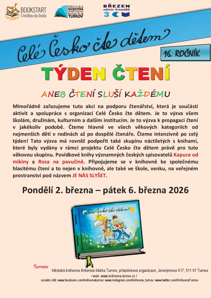Zařazujeme tuto akci na podporu čtenářství, která je součástí aktivit a spolupráce s organizací Celé Česko čte dětem. Je to výzva všem školám, družinám, kulturním a dalším institucím. Je to výzva k propagaci čtení v jakékoliv podobě. Čteme hlavně ve všech věkových kategoriích od nejmenších dětí v rodinách až po dospělé čtenáře. Čteme intenzivně po celý týden! Tato výzva má rovněž podpořit také skupinu náctiletých s knihami, které byly vydány v rámci projektu Celé Česko čte dětem právě pro tuto věkovou skupinu. Povídkové knihy významných českých spisovatelů Kapuce od mikiny a Rosa na pavučině. Připojujeme se ke společnému hlasitému čtení a to nejen v knihovně, ale také ve škole, kdekoliv venku, na veřejném prostranství pod názvem Je nás slyšet. Prioritně se k této aktivitě přihlásila Základní škola 28. října Turnov.