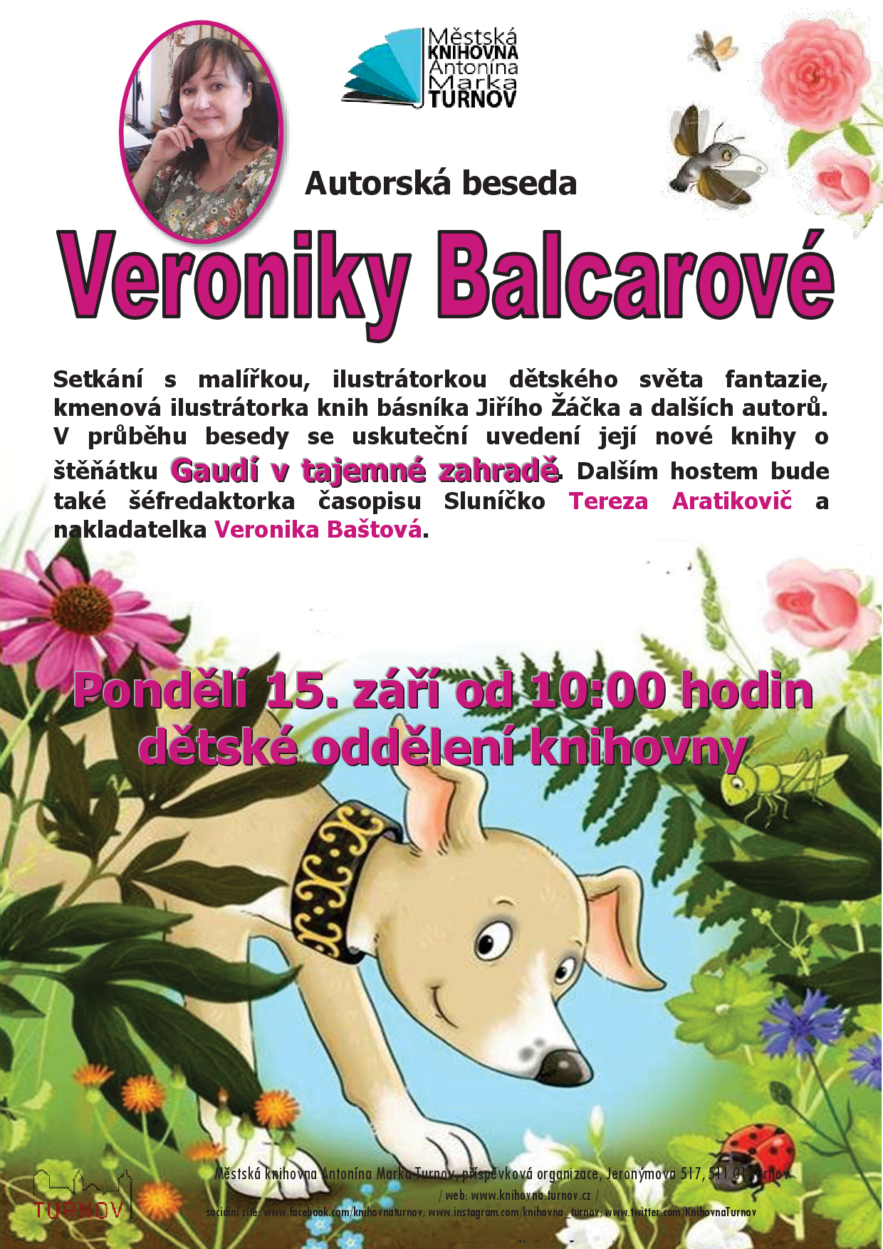 Setkání s malířkou, ilustrátorkou dětského světa fantazie, kmenovou ilustrátorkou knih básníka Jiřího Žáčka a dalších autorů. V průběhu besedy se uskuteční uvedení její nové knihy o štěňátku Gaudí v tajemné zahradě. Dalším hostem bude také šéfredaktorka časopisu Sluníčko Tereza Aratikovič a nakladatelka Veronika Baštová.
