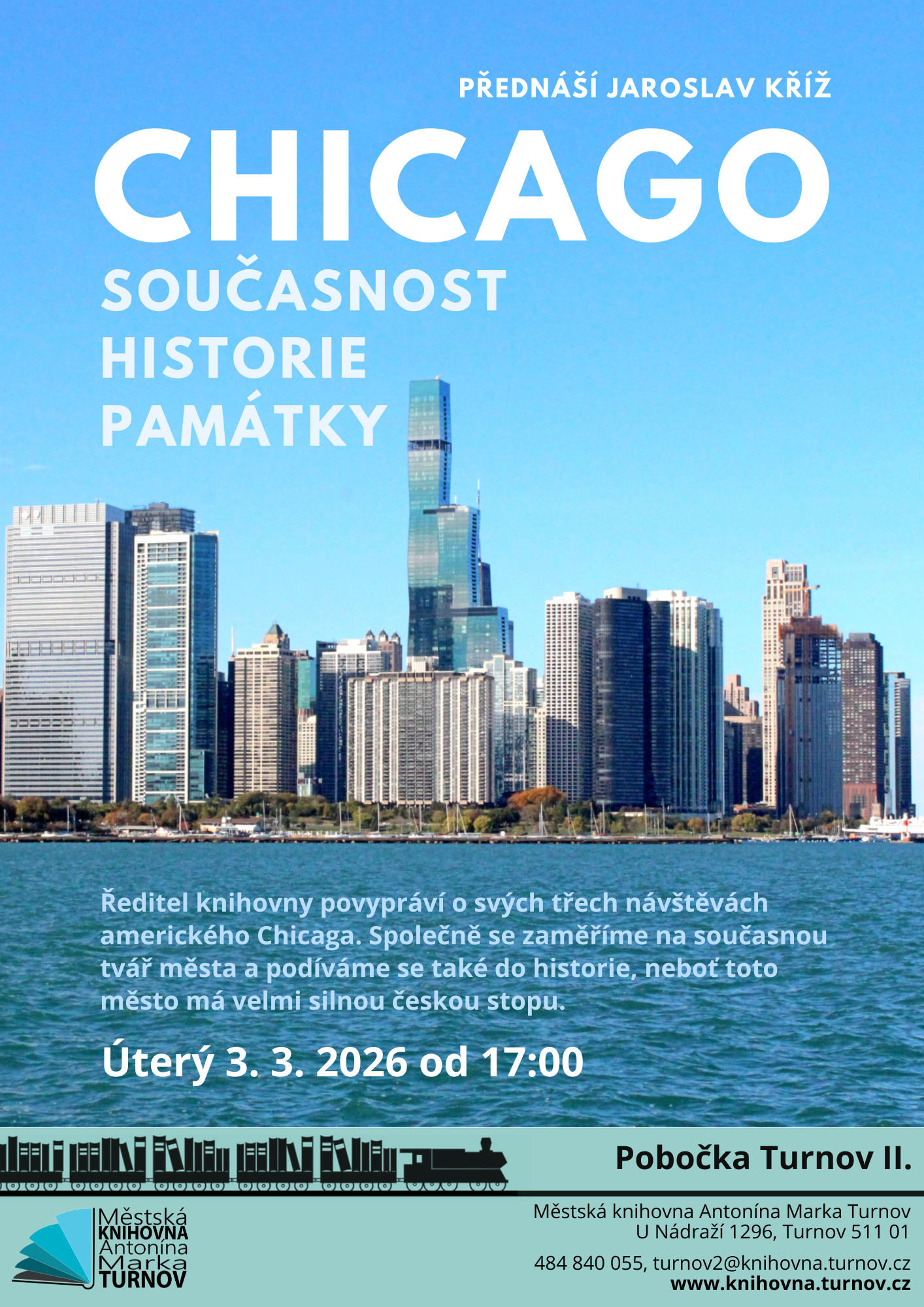 Ředitel knihovny Jaroslav Kříž povypráví o svých třech návštěvách amerického Chicaga. Společně se zaměříme na současnou tvář města a podíváme se také do historie, neboť toto město má velmi silnou českou stopu. Vstup dobrovolný!