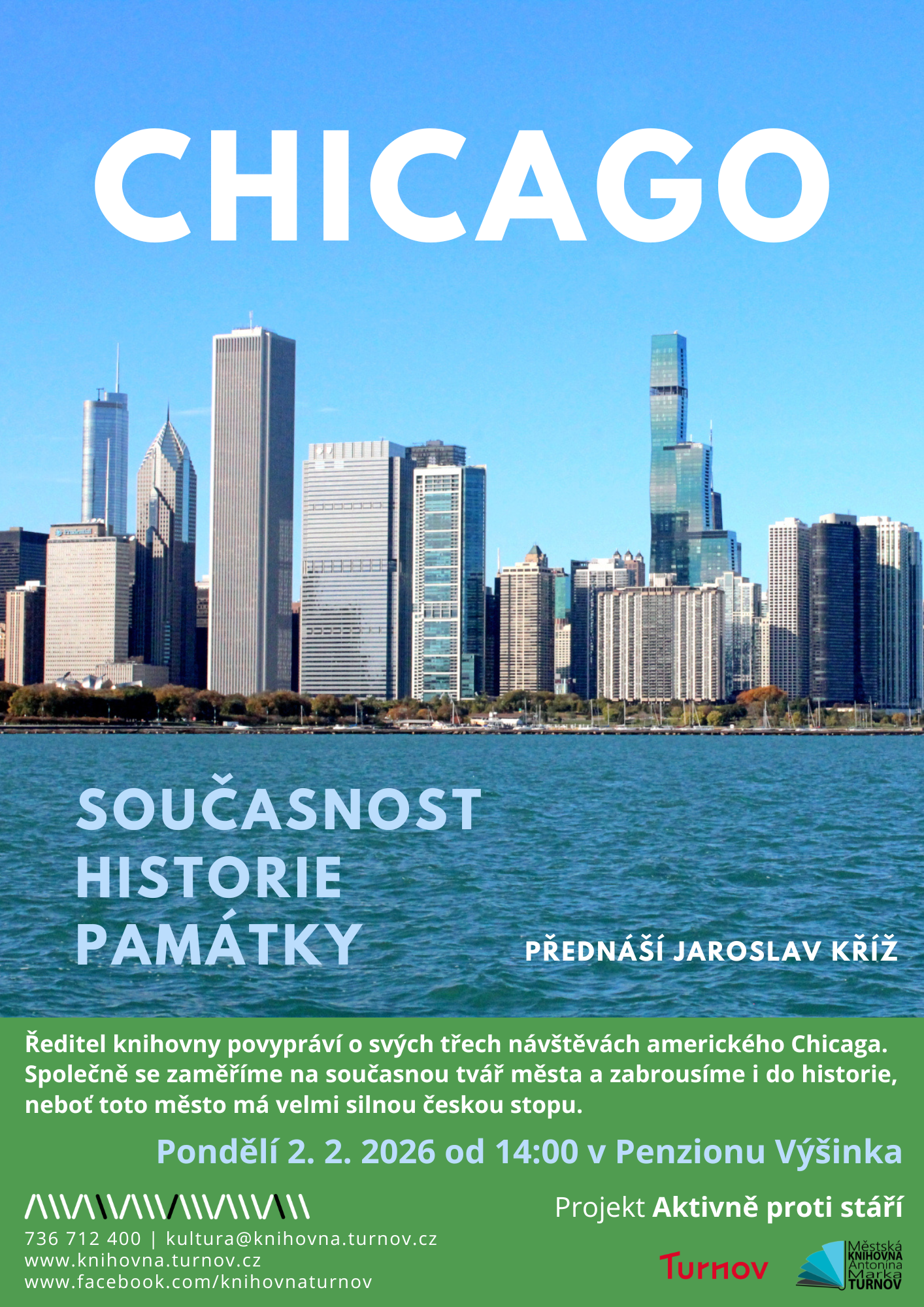 Ředitel knihovny Jaroslav Kříž povypráví o svých třech návštěvách amerického Chicaga. Společně se zaměříme na současnou tvář města a podíváme se také do historie, neboť toto město má velmi silnou českou stopu. Určeno pro obyvatele penzionu a další zájemce z řad veřejnosti. Koná se v rámci projektu Aktivně ve stáří.