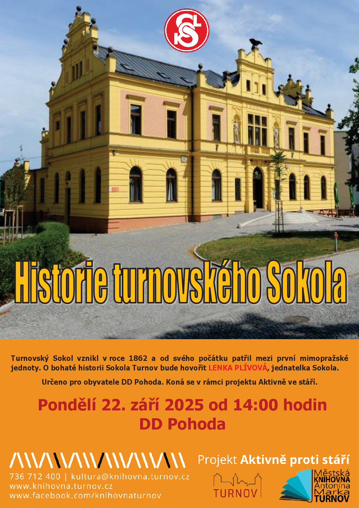 Turnovský Sokol vznikl v roce 1862 a od svého počátku patřil mezi první mimopražské jednoty. O bohaté historii Sokola Turnov bude hovořit Lenka Plívová, jednatelka TJ Sokol. Určeno pro klienty DD Pohoda. Koná se v rámci projektu Aktivně ve stáří.