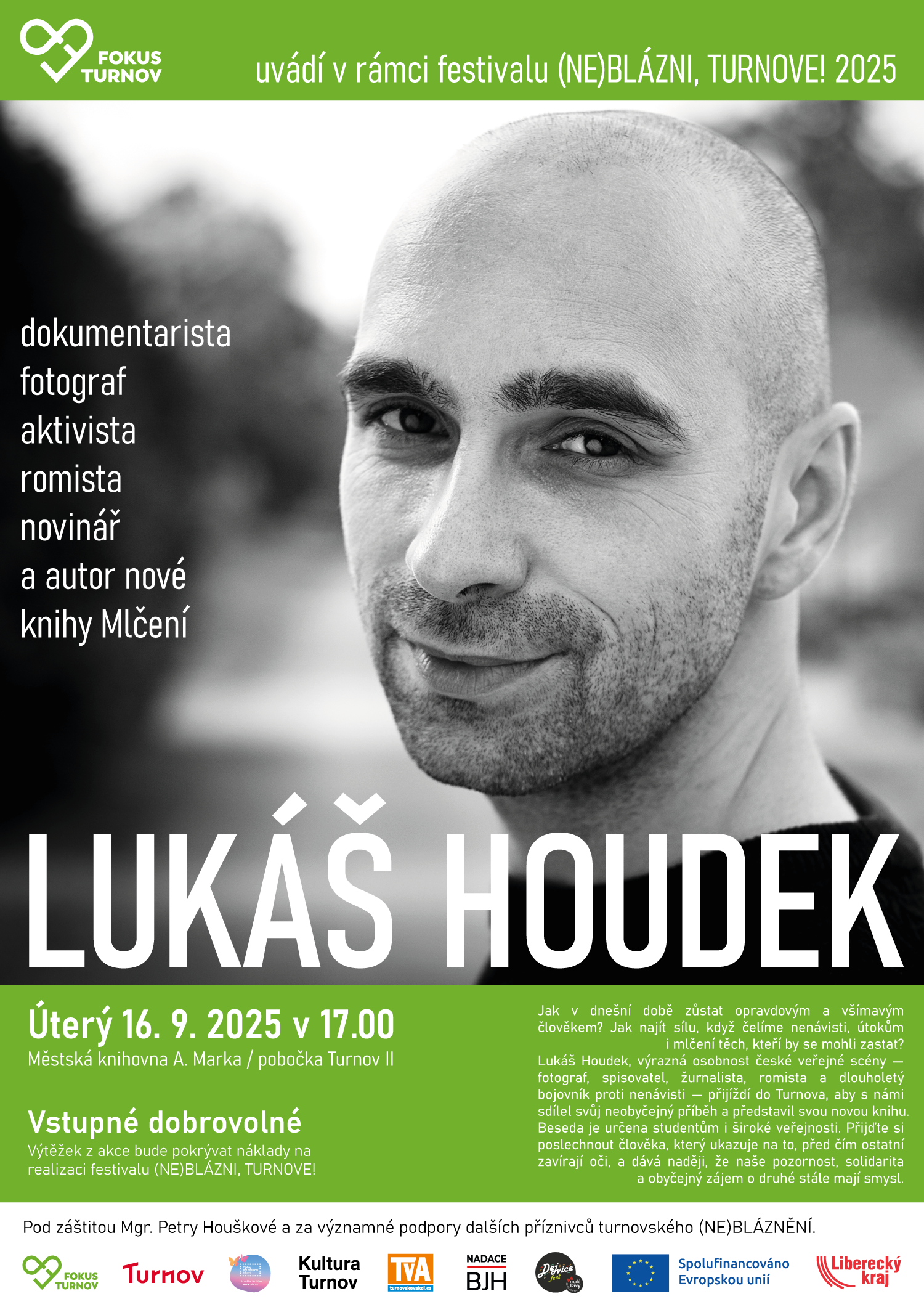 Lukáš Houdek, výrazná osobnost české veřejné scény – fotograf, spisovatel, žurnalista, romista a dlouholetý bojovník proti nenávisti – přijíždí do Turnova, aby s námi sdílel svůj neobyčejný příběh a představil svou novou knihu. Přijďte si poslechnout člověka, který ukazuje na to, před čím ostatní zavírají oči, a dává naději, že naše pozornost, solidarita a obyčejný zájem o druhé stále mají smysl.