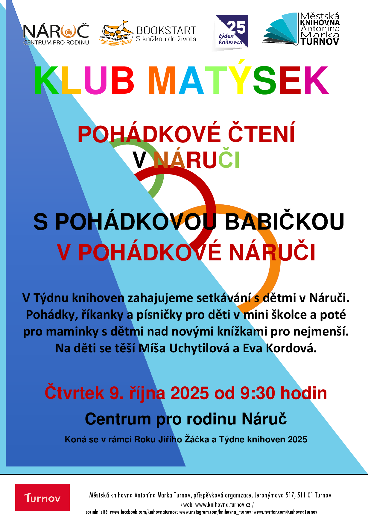V Týdnu knihoven 2025 opět zahajujeme pohádková setkávání v Centru pro rodinu Náruč. A to nejen v mini školce, ale také pro maminky s dětmi. Sejdeme se nad novými knížkami pro nejmenší, nebudou chybět pohádky, říkanky a písničky. Na všechny se těší Míša Uchytilová a Eva Kordová. Koná se v rámci projektu Bookstart S knížkou do života.