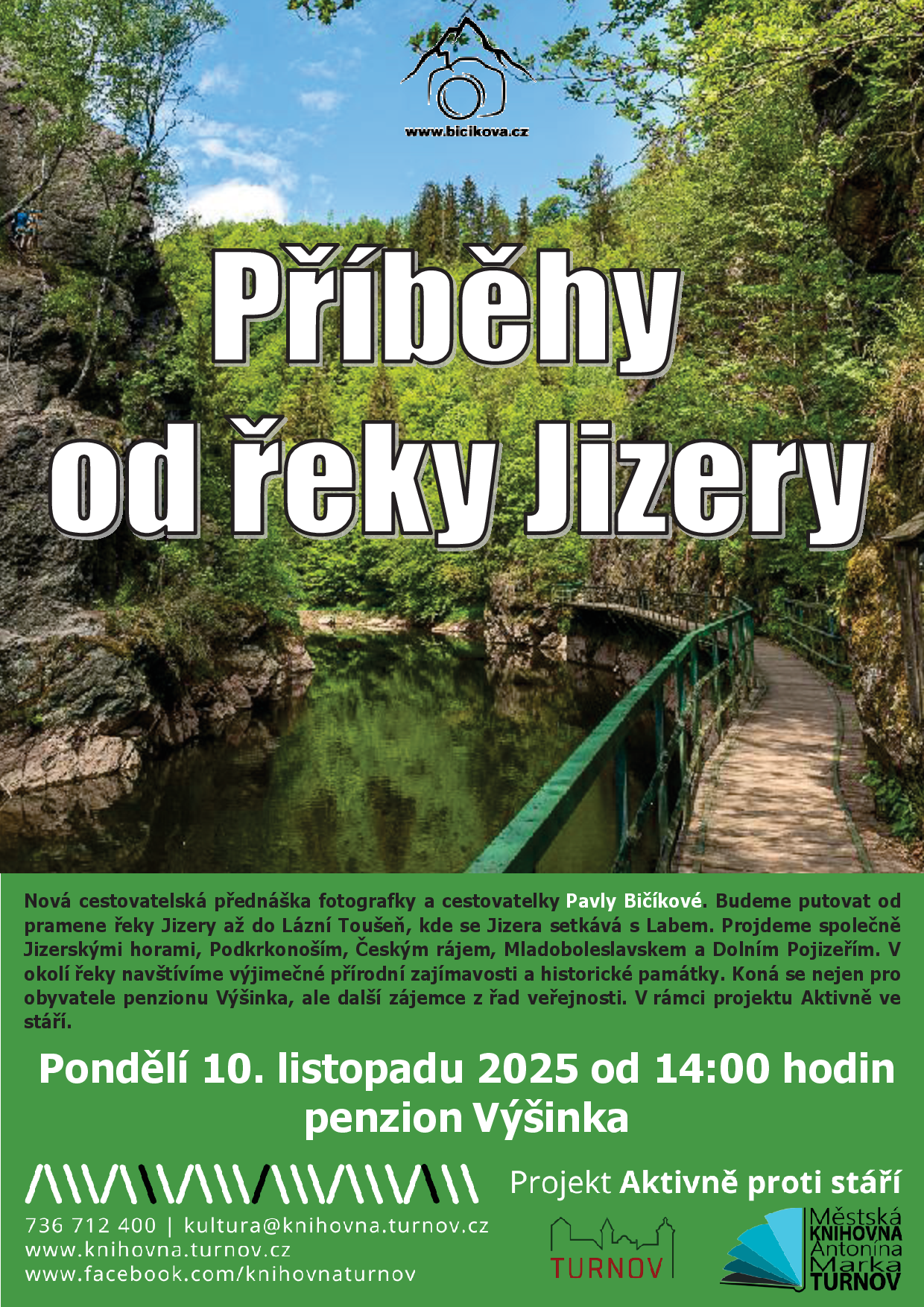 Nová cestovatelská přednáška fotografky a cestovatelky Pavly Bičíkové. Budeme putovat od pramene řeky Jizery až do Lázní Toušeň, kde se Jizera setkává s Labem. Projdeme společně Jizerskými horami, Podkrkonoším, Českým rájem, Mladoboleslavskem a Dolním Pojizeřím. V okolí řeky navštívíme výjimečné přírodní zajímavosti a historické památky. Koná se nejen pro obyvatele penzionu Výšinka, ale další zájemce z řad veřejnosti. V rámci projektu Aktivně ve stáří.