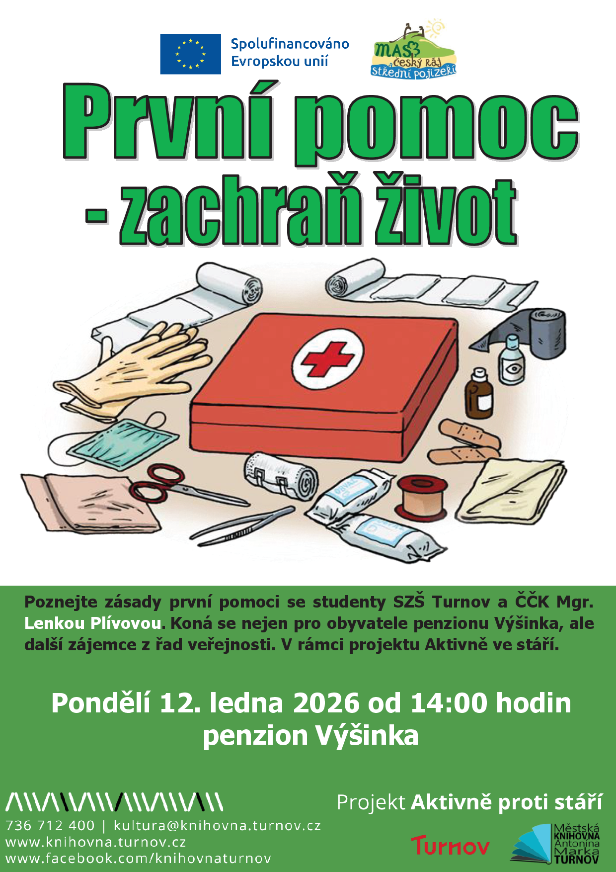 Se zásadami první pomoci seznámí seniory teoreticky i prakticky studenti SZŠ Turnov a Český červený kříž zastoupený Mgr. Lenkou Plívovou. Možný nácvik AED na modelu, bezvědomí, pády u seniorů a co si s sebou vzít do nemocnice. Určeno pro obyvatele penzionu Výšinka a další zájemce z řad veřejnosti. Koná se v rámci projektu Aktivně ve stáří a finančně podpořeno MAS Český ráj za spolufinancování EU.