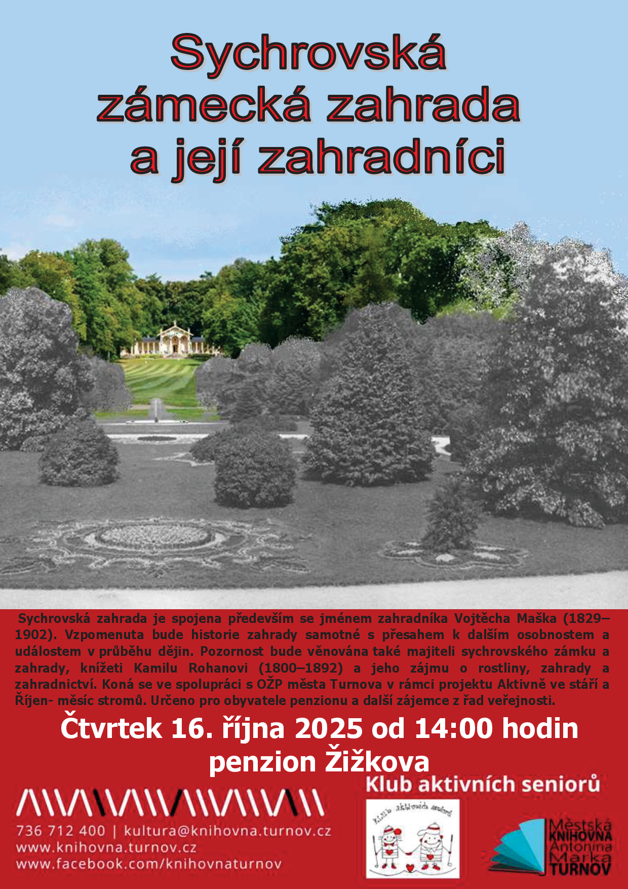 Sychrovská zahrada je spojena především se jménem zahradníka Vojtěcha Maška (1829–1902). Vzpomenuta bude historie zahrady samotné s přesahem k dalším osobnostem a událostem v průběhu dějin. Pozornost bude věnována také majiteli sychrovského zámku a zahrady, knížeti Kamilu Rohanovi (1800–1892) a jeho zájmu o rostliny, zahrady a zahradnictví. Koná se ve spolupráci s OŽP města Turnova v rámci projektu Aktivně ve stáří a Říjen- měsíc stromů. Určeno pro obyvatele penzionu a další zájemce z řad veřejnosti.