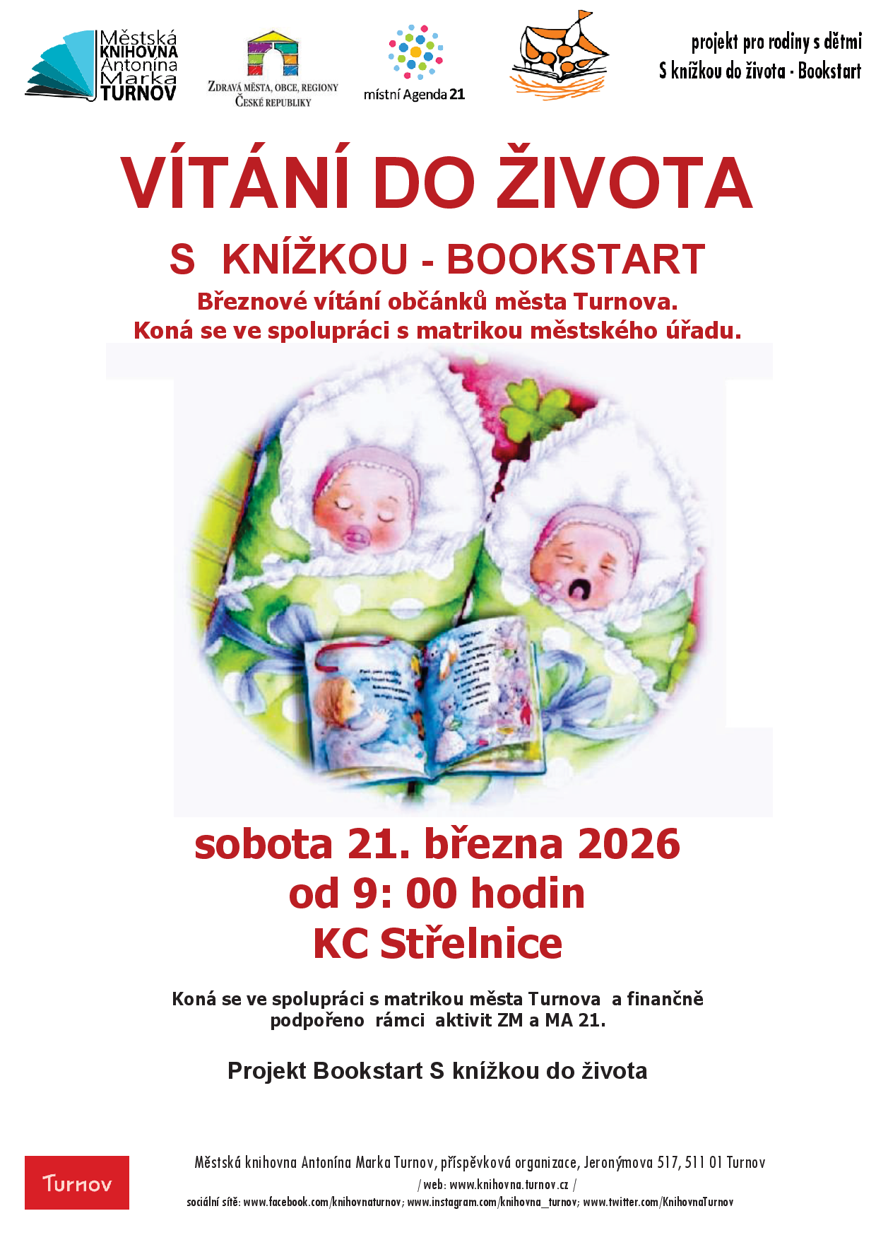 První vítání nových malých občánků v tomto roce bude opět slavnostní příležitostí setkání s rodinami a předání dárků. Každé dítě obdrží do rodiny také dárkový set s knížkou. Tato akce je součástí projektu Bookstart S knížkou do života. Pořádáno ve spolupráci s matrikou městského úřadu a součástí projektu aktivit zdravé město a MA 21.