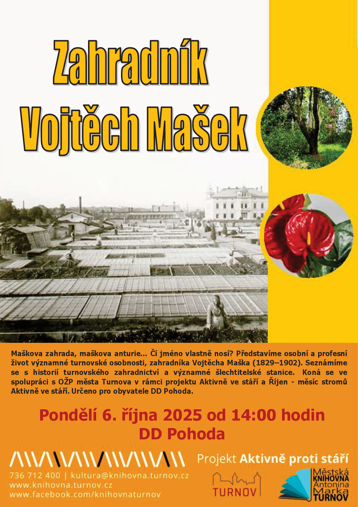 Maškova zahrada, maškova anturie… Čí jméno vlastně nosí? Představíme osobní a profesní život významné turnovské osobnosti, zahradníka Vojtěcha Maška (1829–1902). Seznámíme se s historií turnovského zahradnictví a významné šlechtitelské stanice. Koná se ve spolupráci s OŽP města Turnova v rámci projektu Aktivně ve stáří a Říjen – měsíc stromů Aktivně ve stáří. Určeno pro obyvatele DD Pohoda.