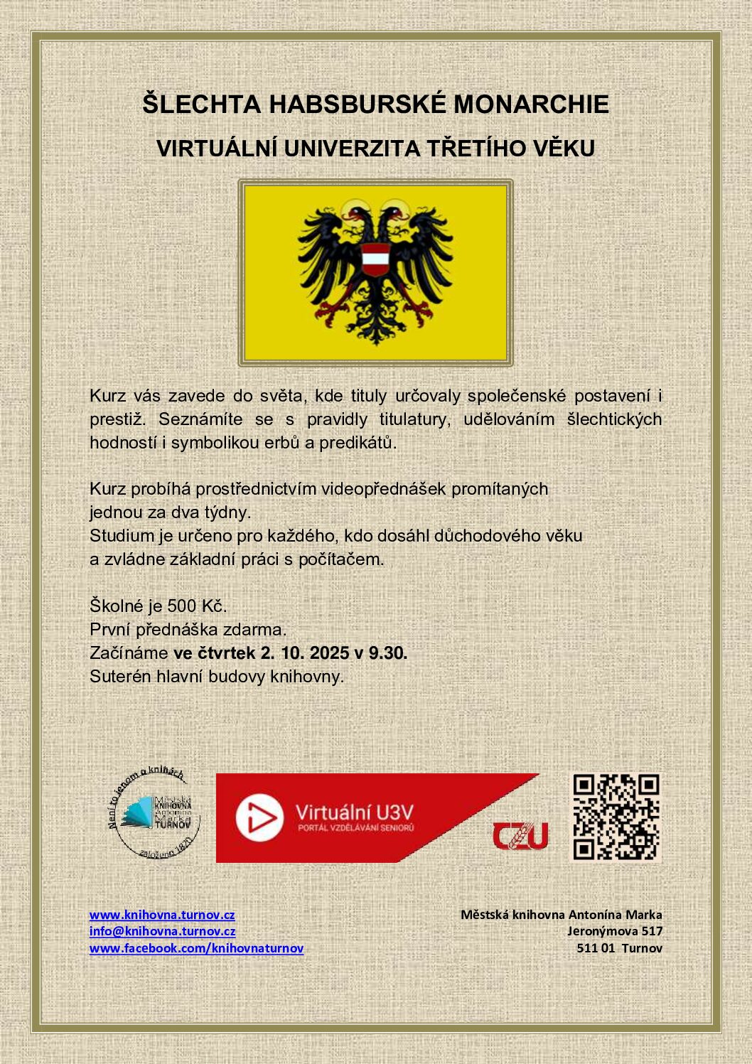 Virtuální Univerzita třetího věku Jedná se o šestidílný vzdělávací kurz zájmového vysokoškolského studia a probíhá prostřednictvím video-přednášek.Studium je určeno všem, kdo dosáhli důchodového věku a zvládnou základní práci s počítačem.Podrobné informace a podmínky studianajdete na: www.e-senior.czu.cz a www. vu3vturnov.webnode.cz. Výukový kurz je...