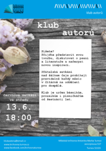 Píšete? Přijďte představit svou tvorbu, diskutovat o psaní a literatuře a načerpat novou inspiraci. Přátelská setkání nad šálkem čaje probíhají pravidelně každý měsíc v čítárně na oddělení pro dospělé. Klub je určen (nejen) začínajícím básníkům, prozaikům a písničkářům od...