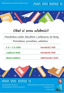 Balení učebnic propukne na dětském oddělení první týden v září! Od středy do pátku, během výpůjční doby, vám pomůžeme obléknout vaše učebnice do nového!