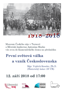 Ve spolupráci s Muzeem Českého ráje v Turnově Vás zveme do Kamenářského domu na odbornou přednášku na téma první světová válka a vznik Československa. Přednášet bude historik Mgr. Vojtěch Kessler, Ph.D. z Historického ústavu Akademie věd České republiky, v....