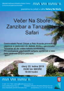 Večery Na Sboře zahajujeme v novém roce 2019 cestopisnou přednáškou. Cestovatelé Pavel Chlum a Petr Kvarda provedou zájemce o cestování do daleké Afriky, z ostrova Zanzibar se dostaneme až do nitra Tanzanie. Při cestopisné přednášce zažijete společně s nimi řadu...