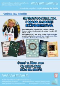 Autorský večer s oblíbenou a velmi čtenou českou spisovatelkou Hanou Marií Kornerovou. Uvedení její nejnovější knihy Hlas kukačky. Prodej knih a autogramiáda. Hudební doprovod Petr Kostka.