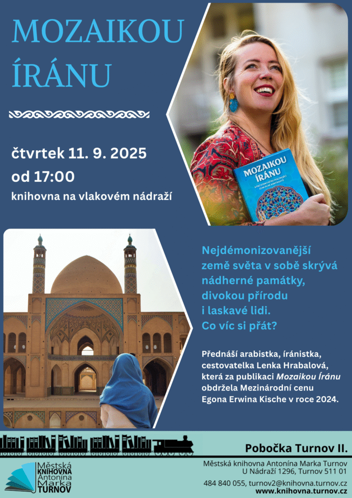 Nejdémonizovanější země světa v sobě skrývá nádherné památky, divokou přírodu i laskavé lidi. Co víc si přát? Přednáší arabistka, íránistka, cestovatelka Lenka Hrabalová, která za publikaci Mozaikou Íránu obdržela Mezinárodní cenu Egona Erwina Kische v roce 2024.