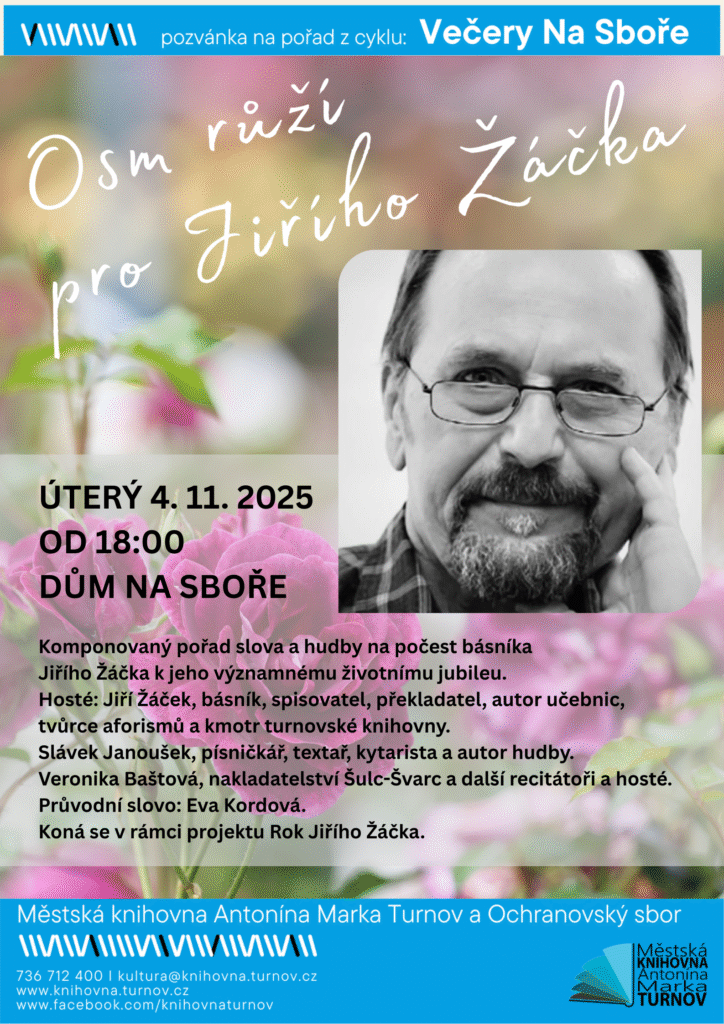 Komponovaný pořad slova a hudby na počest básníka Jiřího Žáčka k jeho významnému životnímu jubileu. Hosté: Jiří Žáček, básník, spisovatel, překladatel, autor učebnic, sběratel a tvůrce aforismů a kmotr turnovské knihovny, Slávek Janoušek, písničkář, textař, kytarista a autor hudby, ...