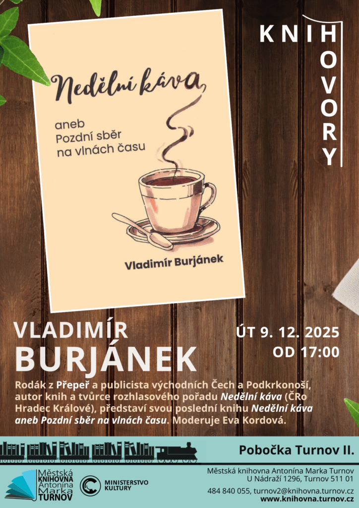 Tentokrát budou Knihovory s regionální osobností, neboť Vladimír Burjánek žije v Přepeřích. Je to regionální publicista východních Čech a Podkrkonoší, autor několika knih a především tvůrce rozhlasového pořadu Nedělní káva, který pravidelně jede na éteru Českého rozhlasu Hradec Králové...