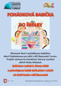Čtení s pohádkovou babičkou dětem v mateřské škole. Mezi děti přijde opět pohádková babička Marie Podzimková. Součást akce Týden čtení a projektu S knížkou do života. Koná se každý další pátek v měsíci
