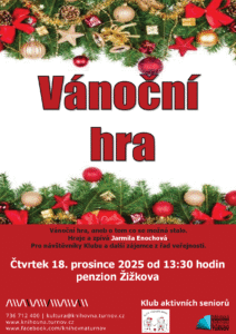 Vánoční hra, aneb o tom co se možná stalo je plná příběhů z Betléma, koled a předvánočního zamyšlení. Hraje a zpívá s kytarou Jarmila Enochová- divadlo Rolnička. Sejdeme se v Klubu aktivní senior penzion Žižkova a jsou vítáni všichni...